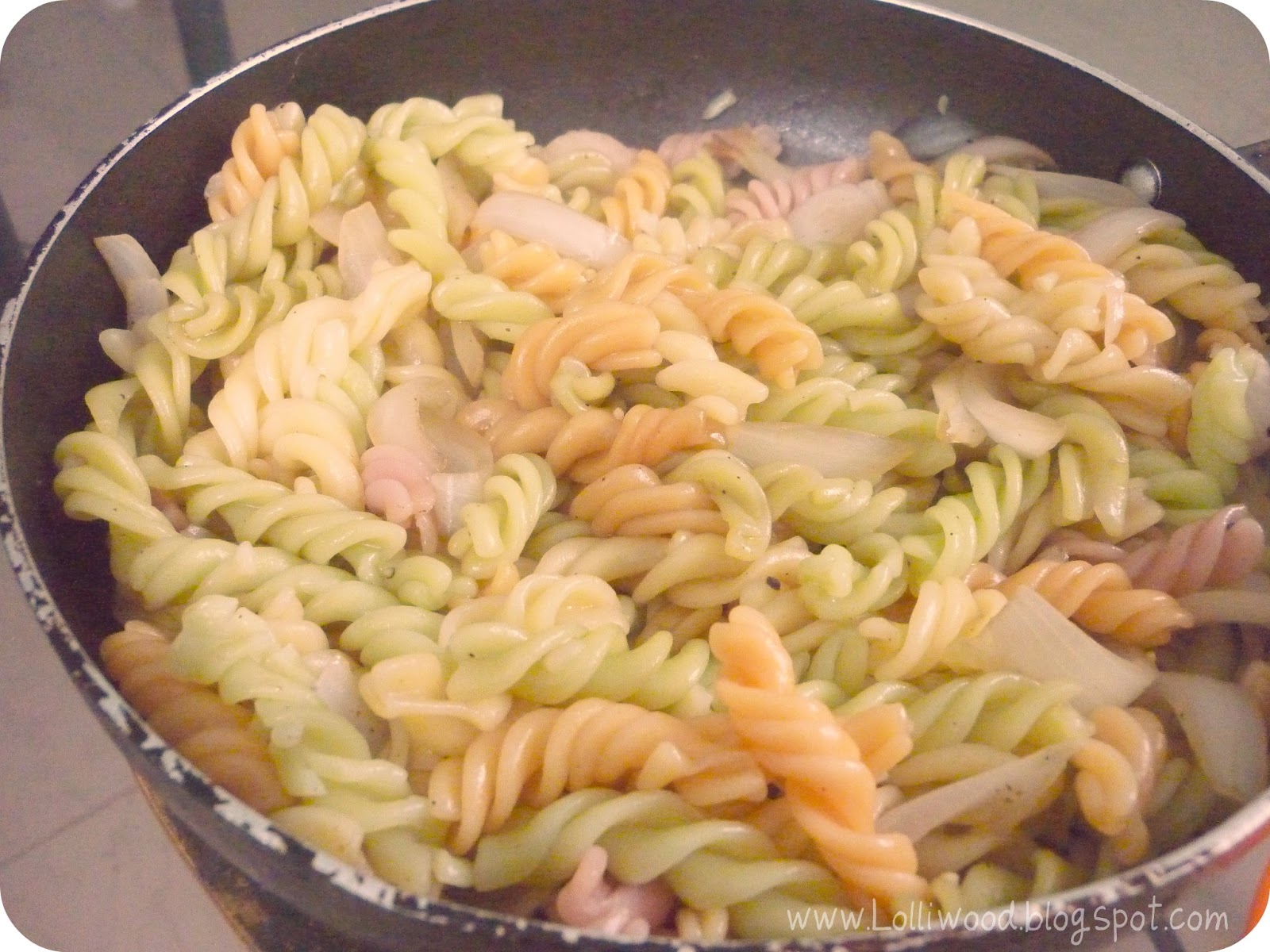 Add the onions, then the macaroni and season with soy sauce plus pepper |